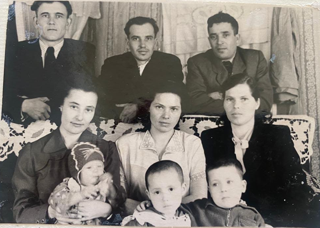 1955 год. Первый ряд справа: Елизавета Павловна Сорокина-Назарова, Мария Павловна Сорокина-Косарева с сыном Юрой, Николай Сергеевич Хачин с дочерью Галиной, Зинаида Павловна Хачина-Сорокина, Горюнов Алексей – родственник Косаревых.